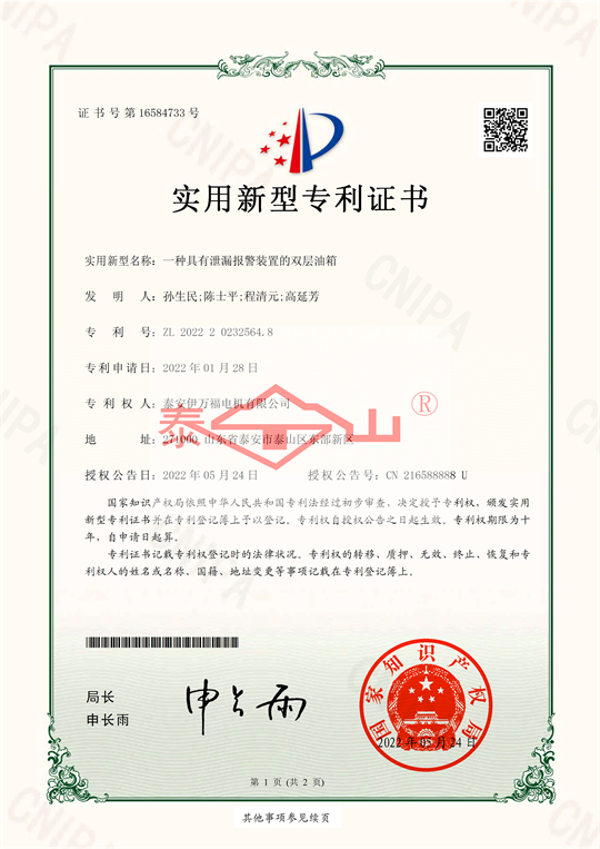 喜報(bào):泰安伊萬(wàn)福電機(jī)有限公司獲得六項(xiàng)實(shí)用新型專利證書